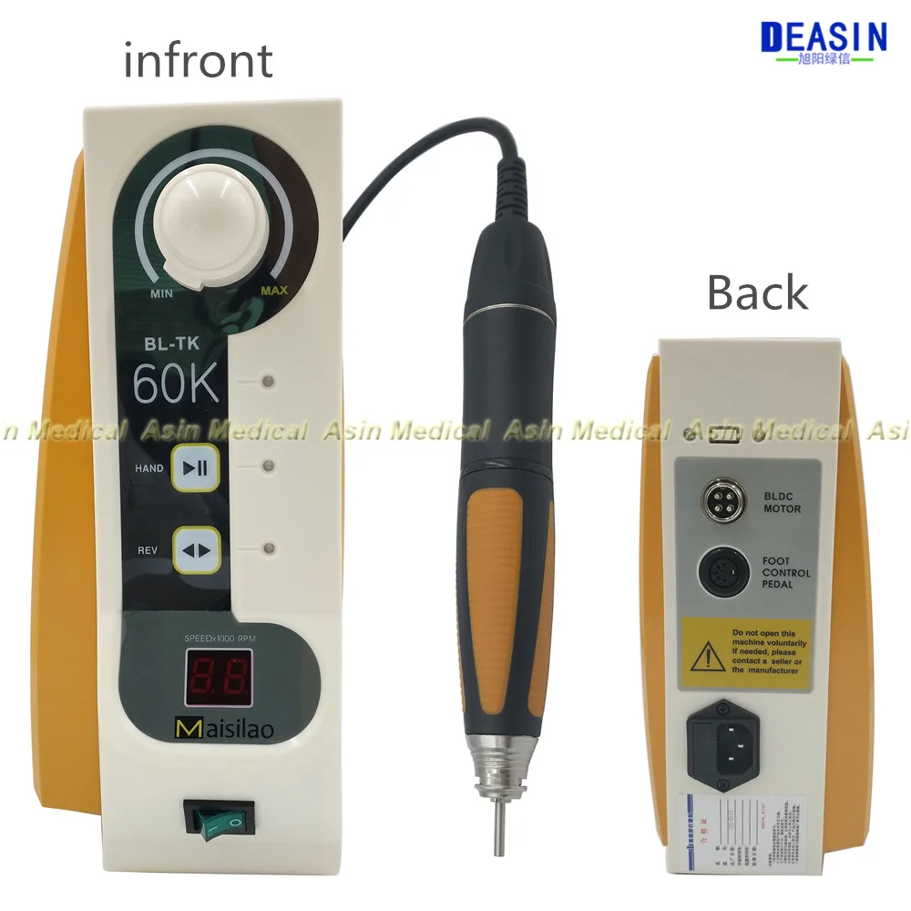 Product Description Brand: maisilao speed control : By hand maximum speed : 60,000 RPM. Handpiece type : brushless reverse function: available optional : A:foot switchor B: knee switch ( ON/ OFF switch , can not control speed ) If choose A , the package withoutkneed switch functionn, choose B , the packge withoutfoot pedal . If customer without special message , we will send type A . Input Voltage: 110V or 220V packing list : multi-fuction control box --1 brushless handpiece --1 other accessories---some